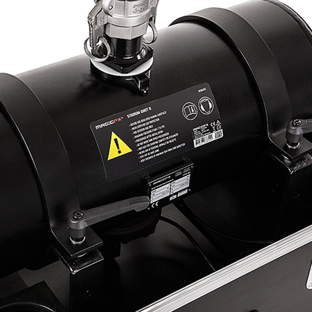 Product Specificaties: • Maximale output: 25m • Opwarmtijd: geen • Verpakking: Per 1 stuk in flightcase • Fabrikant: MagicFX • Extra info: Compressor nodig Technische Specificaties • Afmetingen: 60 x 80 x 86 cm • Gewicht: 110 Kg (zonder confetti) • Spanning: 100-250 V • Vermogen: 20W • Sturing: Direct 230v of 24v (op DMX dmv een Switchpack) • Consumables: Confetti, Streamers • Consumables Vulling: Confetti tot 3kg ** • Consumables Vulling: Streamers tot 20 Polybags ** • Aansluiting Stroom: PowerCON TRUE1 IN/UIT • Aansluiting Data: – ** Max. vulling per schot Papier Confetti: 2 kg Metallic Confetti: 3 kg Streamers 20 m x 5 cm: 8 Polybags Streamers 20 m x 2.5 cm: 9 Polybags Streamers 10 m x 5 cm: 15 Polybags Streamers 10 m x 2.5 cm: 18 Polybags Streamers 10 m x 1.5 cm: 20 Polybags