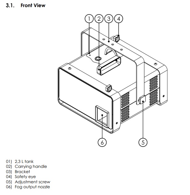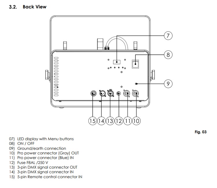 [GENERAL] Specificaties: Fabrikant: Highlite: Model: 1500F Maximale output: niet bekend Opwarmtijd: 4 minuten Verpakking: Per stuk in flightcase [TECHNICAL SPECIFICATIONS] Afmetingen: 39 x 33 x 41 cm Gewicht: 15 Kg Vermogen: 230 V Power: 1500W Control: DMX-512 Consumables: Showtec / Jem Rookvloeistof Consumables Load: 2.3L Interface: PowerCON Blue / White, XLR 5-pin DMX Profile DMX Footprint: 2ch CH1 (0-255) – Effect 0-255 = Output 0-100% CH2 (0-255) – Fan 0-255 = Fan Output 0-100%