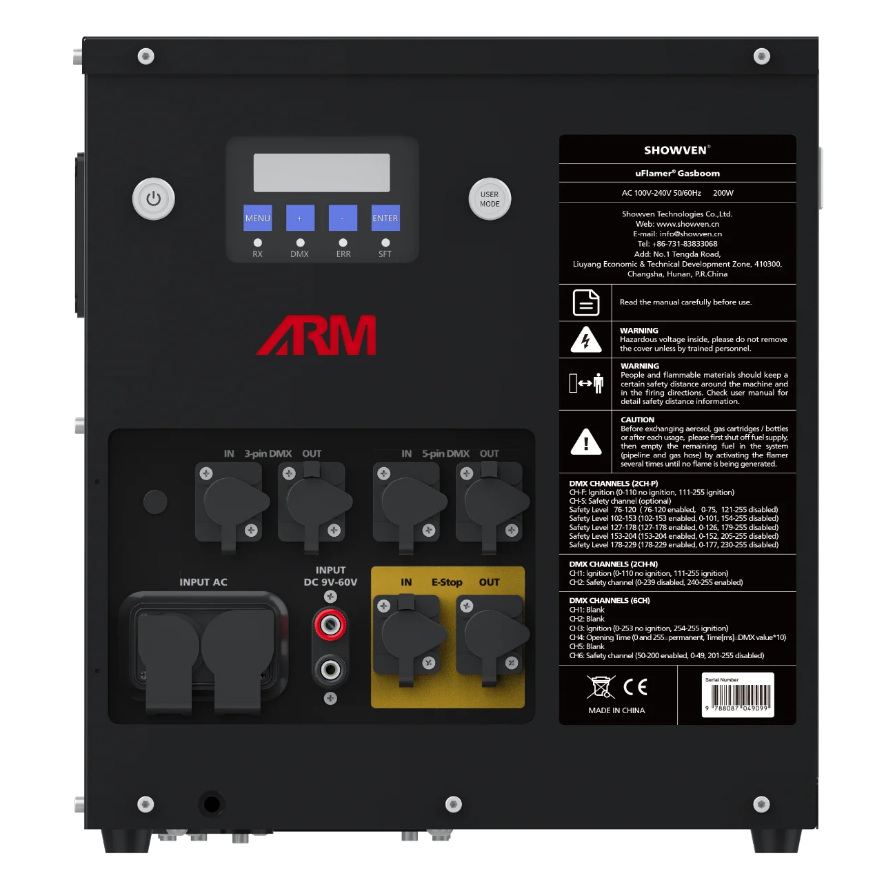 [PRODUCT SPECIFICATIONS] Fabrikant: Showven Model: Gas Boom Maximale output: 8m Verpakking: Per 1 of 2 stuks in flightcase Extra info: Cartridge houder voor 4 cans is optioneel verkrijgbaar. [TECHNICAL SPECIFICATIONS] Afmetingen: 31 x 32 x 31,1 cm Gewicht: 13,1 Kg Spanning: 100-250 V Vermogen: 200W Sturing: DMX-512 of 9-60v Consumables: LPG propane or butane gas, gas cartridges bottle, aerosol cartridges Consumables Vulling: 1 tm 4 cartridges Verbruik: Effect: 2-6m Aansluiting Stroom: PowerCON TRUE1 IN/UIT Aansluiting Data: XLR12.7 cm/UIT Aansluiting E Stop: XLR3P [DMX PROFILE] DMX Footprint: 2ch P mode CH1 (0-255) – Effect 0-110 = Geen Effect 111-255 = Effect CH2 (0-255) – Safety Kanaal 0-101 = Apparaat niet actief 102-153 = Apparaat actief 154-255 = Apparaat niet actief